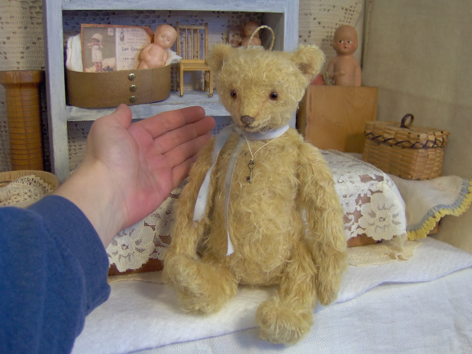 I am happy to announce my new bears,kitty cats,rabbits and pandas are now listed in my ETSY shop. This was a very large update of 12 new bears and friends. I have added two brand new bear designs (last two photos) a white antique style ted who measures 7 inches tall and a larger antique style gold bear who measures 10 inches tall. I also added the very popular pink mohair tabby kitty so I hope you get the chance to visit my shop. I plan on adding weekly listings plus one monthly update starting in March. Thank you for taking the time to visit and I hope you enjoyed meeting the gang! xxxxxxSharie